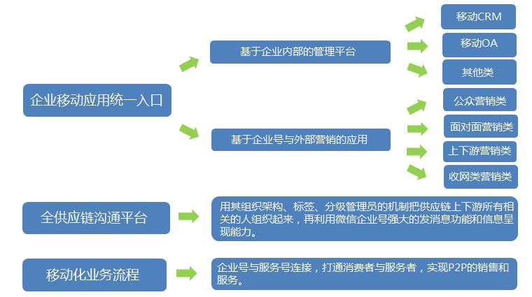 基于企业真实应用场景,推出基于移动沟通协作,移动销售管理、移动信息采集和社会化应用等不同场景下的应用。企微现有4大应用场景,14个应用,主要包括企业通讯录、新闻公告、会议助手、同事社区、任务分派、移动审批、请假申请、工作日志、移动外勤、移动CRM、知识百科、超级表单、企业活动、问卷调查等。