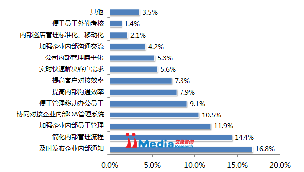 关于中国中小企业微信企业号使用主要目的分布,数据显示,16.8%的中国中小企业认为使用微信企业号的主要目的在于及时发布企业内部通知,14.4%的中国中小企业认为使用微信企业号的主要目的在于简化内部管理流程。分析认为,目前企业主要利用微信企业号在移动端办公快捷便利的特性,达到更好的及时发布通知,加强管理。另外,微信企业号在移动考勤,客户沟通等方面也将发挥重要作用。