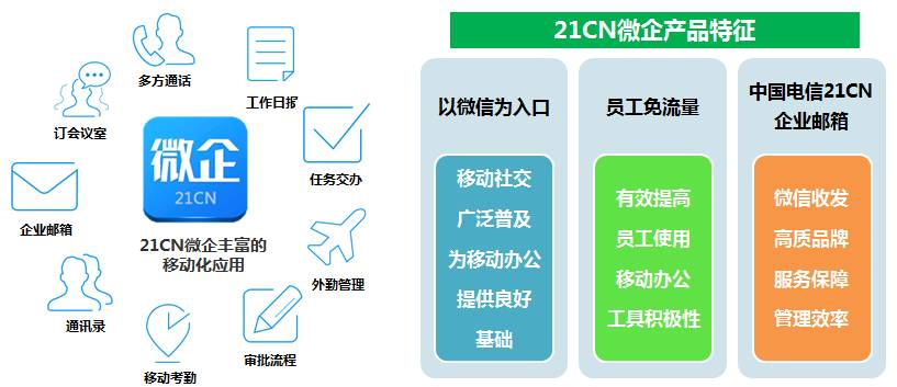 21CN微企是由中国电信旗下的全资子公司世纪龙信息网络有限责任公司开发的移动办公产品,是基于微信企业号的应用,为企业用户提供高效便捷的移动办公服务,提供的企业应用场景包括协同办公及移动管控,丰富的移动应用如企业邮箱、移动考勤、外勤管理、工作日报、通讯录、个人中心、审批流程、多方通话、订会议室、任务交办、无限容量等。
