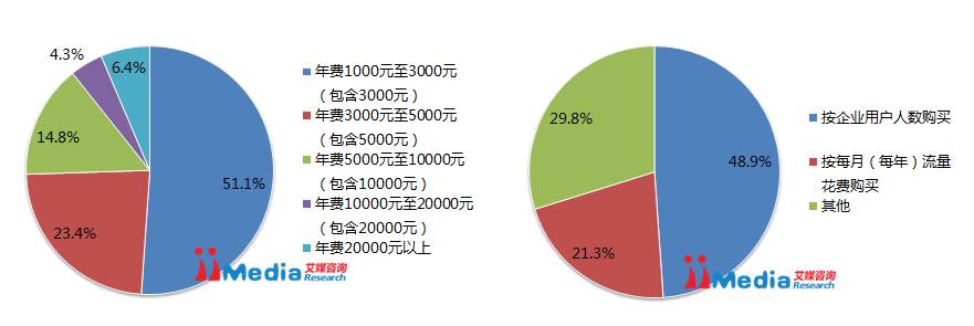 数据显示,51.1%的中国中小企业每年在微信企业号第三方服务商的花费预算在1000元至3000元,23.4%的中国中小企业该方面预算在3000元至5000元。而在购买单位上,48.9%的中国中小企业希望按企业用户人数购买,21.3%的中国中小企业则希望按每月(每年)流量花费购买。分析认为,目前微信企业号市场仍然处于初始阶段,各企业对微信企业号在办公管理辅助方面的认识仍有不足,这也导致了各企业在该方面的预算仍处于一个较低的水平。