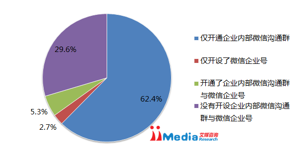 数据显示,开通了企业内部微信沟通群与微信企业号的企业占比为5.3%,仅开设微信企业号的企业占比为2.7%,而仅开通了企业内部微信沟通群的占比则达到了62.4%。在目前微信已作为大部分企业内部沟通的主要工具的背景下,微信企业号在中国中小企业企业中的覆盖仍然偏低,但基于更加规范和高效的管理,微信企业号在企业中的覆盖有望进一步提升。