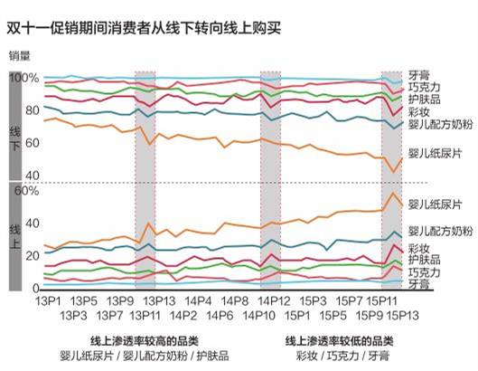 在双十一中,老网购用户仅贡献了 28% 的增长,有 76% 的增长都来自新增网购用户,在新增网购用户中,约有 38% 在过去 12 个月内从未进行过线上购物。可见,双十一期间的线上销售增长很大程度上是以牺牲线下渠道的销量为代价的。
