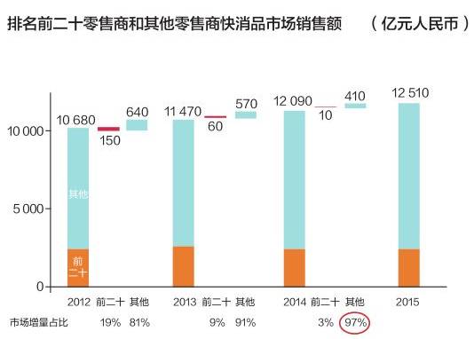 在过去十年中,重塑中国零售环境的大卖场,首次出现了负增长的状态,在城市快速消费品市场的销售额下跌0.2%, 客流减少4.6%, 家庭平均购物量降低4.7%。 超市/小超市的增长也颇为乏力, 增速从9.5%降低至4%。