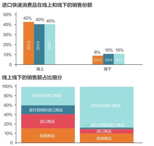 进口快速消费品在线上购买的可能性比线下购买高出四倍之多。在线上零售产品中,大约有三分之二都是进口产品和促销产品,是线下市场份额的两倍。