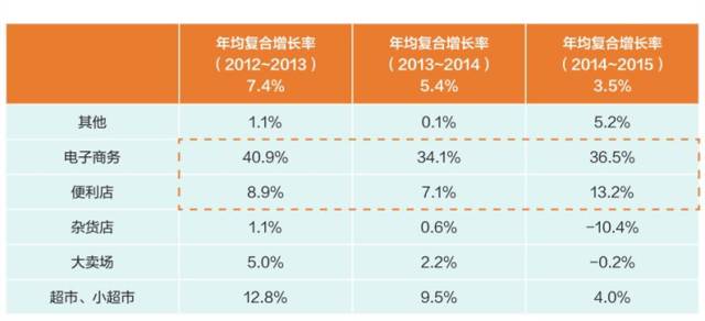从这张图片中,我们或许能到中国零售额的比例组成是什么样子的,连实体店铺都要走向个性化,专业化.以及提供新的生活方式的,消费结构的升级,大型的卖场发展已经到了天花板,如果不提供自身的服务以及消费者信息的深层次分析,那就很糟糕! 当然如果从平民创业者的来选择行业的话,相信大部分的都趋向于电子商务,毕竟市场的容量大嘛。传统的大家都实体,投入与产出比例并不是你想要的,唯独便利店成了新的宠儿...